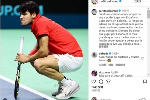 阿爾卡拉斯寫道:“我非常遺憾地宣布,我無法代表西班牙參加在博洛尼亞舉行的戴維斯杯比賽。我的右腿腘繩肌出現(xiàn)水腫,醫(yī)生建議我不要參賽。”