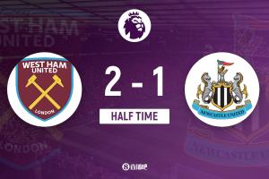 上半場比賽結束,西漢姆聯2-1紐卡斯爾聯。