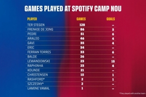 在當前陣容中,五位隊長中的四位占據了隊內諾坎普球場出場次數榜的前列:特爾施特根、弗蘭基·德容、佩德里和阿勞霍。