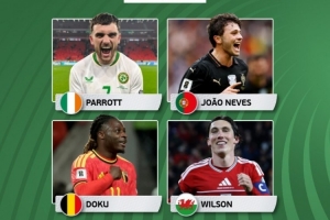 體育資訊11月19日訊 歐洲世預賽最后一輪比賽戰罷,歐足聯官方公布了本輪最佳球員候選名單。