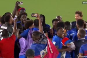 在比賽結束后,海地球員圍在一起等待哥斯達黎加vs洪都拉斯的結果。在哥斯達黎加vs洪都拉斯比賽結束后,海地球員瘋狂慶祝。