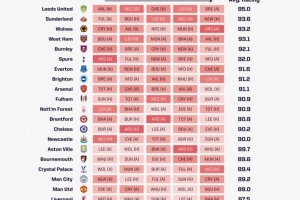 OPTA為各隊未來5輪聯(lián)賽的困難程度進行了量化打分,利茲聯(lián)賽程95.0分最困難,桑德蘭(93.6分)、狼隊(93.2分)、西漢姆(93.1分)、伯恩利(92.1分)分列二到五位。