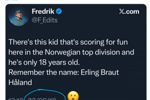 2018年9月23日,記者Fredrik在社交媒體上寫道:“挪威頂級聯賽有一個少年,進球如同探囊取物,而他只有18歲。請記住這個名字——埃爾林·布賴于特-哈蘭德?!?/p>