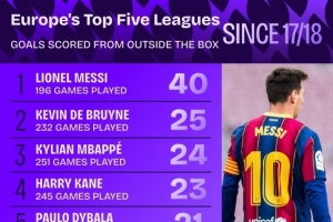 體育資訊11月19日訊 Squawka統(tǒng)計了2017-2018賽季以來球員在五大聯(lián)賽禁區(qū)外遠(yuǎn)射的進(jìn)球數(shù)量,并列出榜單,梅西40球居首,德布勞內(nèi)25球次席。