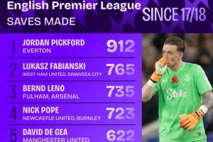 體育資訊11月19日訊 Squawka統計17-18賽季至今英超門將撲救次數,皮克福德912次居首,法比安斯基第二。