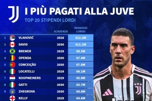 體育資訊11月20日訊 德國轉會市場統計了尤文球員的稅前年薪,并列出前二十名榜單,弗拉霍維奇2220萬歐居首,戴維1110萬歐次席。