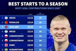 體育資訊11月20日訊 德轉(zhuǎn)統(tǒng)計了本世紀(jì)賽季開局的進(jìn)球貢獻(xiàn)數(shù),哈蘭德以35粒進(jìn)球位居歷史第三,僅次于梅西和C羅。