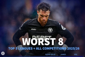 體育資訊11月21日訊 五大聯(lián)賽即將重燃戰(zhàn)火,《轉(zhuǎn)會(huì)市場(chǎng)》統(tǒng)計(jì)了本賽季至今五大聯(lián)賽球隊(duì)的各項(xiàng)賽事場(chǎng)均拿分最少情況,英超的狼隊(duì)以場(chǎng)均0.57分墊底。