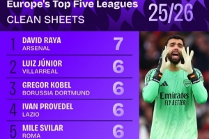 體育資訊11月21日訊 五大聯賽戰火即將重燃,數據機構squakwa也統計了本賽季五大聯賽門將零封場次榜,槍手門將拉亞居首。