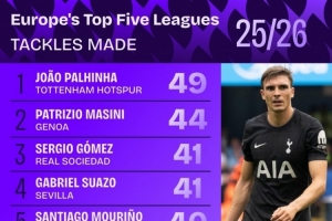 本賽季五大聯賽成功搶斷排名: