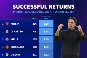 體育資訊11月21日訊 德國轉會市場統計了教練執教球員時代英超老東家的場均積分,并列出榜單,阿爾特塔1.99分居首,迪馬特奧1.98分次席。