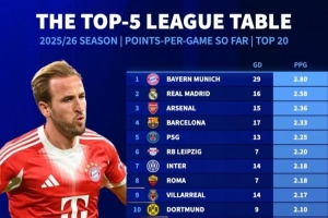 體育資訊11月21日訊 五大聯賽戰火即將重燃,《轉會市場》也統計了本賽季五大聯賽球隊場均拿分情況,拜仁獨自領跑。