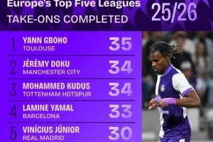 本賽季五大聯賽成功過人榜: