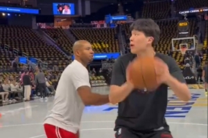賽前,楊瀚森在助教陪同下進行熱身,對抗后連續勾手命中,同時送出單臂暴扣,三分7中7。