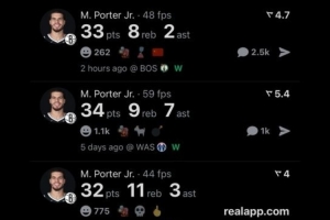 數(shù)據(jù)美媒Real Sports曬出小波特本賽季30+場次(5次)數(shù)據(jù),并寫道:“進攻頭號選擇的小波特。”