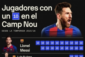 15-16賽季以來諾坎普獲評10分場次排名: