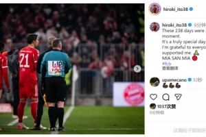 伊藤洋輝賽后在社交媒體上寫道:“這238天,都是為了這一刻。 對我來說這真的是一個特別的日子。 感謝所有支持過我的人??MIA SAN MIA??”