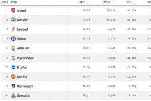 數(shù)據(jù)機構(gòu)Opta的大數(shù)據(jù)預(yù)測再度進行更新,目前英超各隊的奪冠概率:阿森納奪冠概率升至70.18%,曼城18.11%;利物浦4.22%,切爾西3.47%。該榜單的第5名為1.44%的維拉,其余球隊奪冠概率均不足1%。