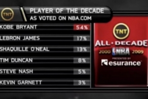 科比自媒體Kobe Bryant Stories & Motivation則曬出了一則多年前TNT電視直播畫面,內容為NBA官網2000-2009最佳球員投票結果,科比得票率54%高居第一,第二的詹姆斯和第三的奧尼爾合計得票率30%。
