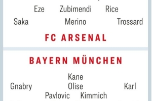體育資訊11月24日訊 拜仁和阿森納在本輪聯賽各自取得大勝,兩隊也將在周中迎來歐冠榜首之爭,拜仁作客挑戰阿森納?!短咔蛘摺芬差A測了雙方首發: