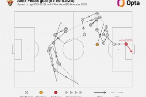 數據統計顯示,這粒進球經歷了22腳傳遞,是本賽季西甲第二多。