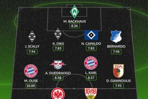 中場:邁克爾·奧利塞(拜仁,10.00分)、阿桑·韋德拉奧果(萊比錫,8.58分)、倫納特·卡爾(拜仁,8.57分)、迪米特里斯·吉安努利斯(奧格斯堡,7.95分)
