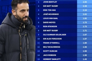 體育資訊11月25日訊 《轉(zhuǎn)會(huì)市場》統(tǒng)計(jì)了阿莫林執(zhí)教第一年在老特拉福德的場均拿分情況,1.43分僅能位列隊(duì)史第16位。