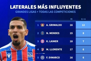 體育資訊11月25日訊 德國轉會市場統計了本賽季五大聯賽邊衛的參與進球數量,并列出榜單,格里馬爾多參與12球居首,努諾·門德斯參與8球次席。