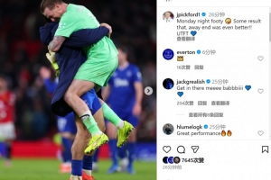 皮克福德社媒曬出慶祝的照片,配文:“周一足球之夜,這樣的結果太棒了,客場看臺的氛圍更是無敵,加油埃弗頓!”