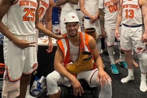 尼克斯戰(zhàn)勝籃網(wǎng),賽后球隊評選哈特當選本場最佳防守球員,他在更衣室穿工地服裝和帽子與隊友合影。