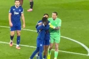 蓋耶染紅后情緒激動喋喋不休,皮克福德和恩迪亞耶抱住安撫,蓋耶仍在揮拳似乎要打人。