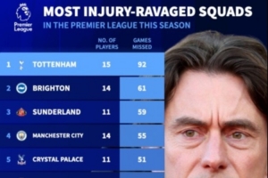 體育資訊11月25日訊 德轉列本賽季英超球隊傷病榜,熱刺15名球員受傷,共計缺席92場比賽排名第一,布萊頓、桑德蘭位列二三位。