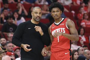 火箭有阿門和申京兩個能一對一破壞防守的強點,謝潑德也能持球策動擋拆,一旦太陽強側堆人,火箭通過流暢的突分轉移球下起了三分——申京、霍勒迪、史密斯、戴維森上半場合計命中8記三分,尤其霍勒迪替補命中4記三分,火箭利用強弱側相互呼應的內外結合打法早早建立起13分領先優勢。