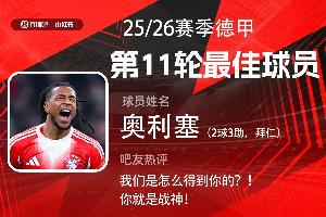第十一輪評選結果結出爐,奧利塞2射3傳超神表現,幫助拜仁讓2追6擊敗弗萊堡,獲得吧友超4.2萬票支持。奧利塞毫無懸念當選【體育資訊X小紅書德甲第11輪最佳球員】!