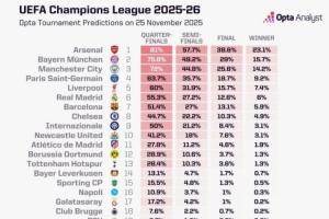體育資訊11月25日訊 歐冠聯賽階段第5輪明日打響,Opta超算給出了最新的歐冠奪冠概率,其中阿森納以23.09%高居第一位,拜仁15.67%緊隨其后,曼城14.2%排名第三。