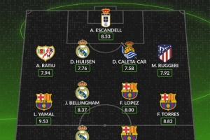 體育資訊11月25日訊 西甲聯賽第13輪已經完賽,whoscored也列出了本輪西甲評分最佳陣容,巴薩4將、皇馬3人在列。