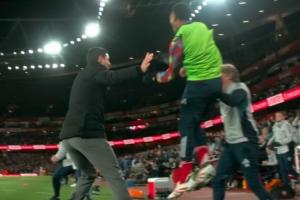 當(dāng)埃澤第76分鐘破門,上演帽子戲法幫助阿森納4-1領(lǐng)先熱刺時(shí),原本在熱身的斯凱利沖向教練席高高躍起振臂歡呼,隨后他和阿爾特塔為首的教練組相擁慶祝,替補(bǔ)席上的多名隊(duì)員隨后也加入慶祝。
