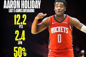阿隆·霍勒迪近5場比賽場均12.2分,投進2.4個三分,三分命中率50%(24中12),場均正負值+7.4。