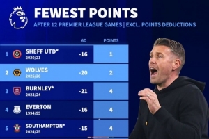 南安普頓(24/25賽季12分)、桑德蘭(05/06賽季15分)、謝菲聯(23/24賽季16分)也是此前的英超單賽季積分倒數前四。