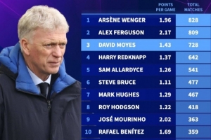 體育資訊11月26日訊 德國轉會市場統計了英超主帥執教場次排名,莫耶斯728場排名第三,有望追趕弗格森和溫格。