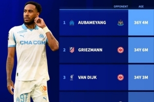 德轉統計表明,奧巴梅揚成為本賽季歐冠年紀最大的進球球員,今天他的具體年齡為36歲4個月。