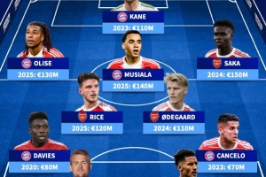中場/邊鋒:賴斯(2025年1.2億歐)、厄德高(2024年1.1億歐)、奧利塞(2025年1.3億歐)、穆西亞拉(2025年1.4億歐)、薩卡(2024年1.5億歐)