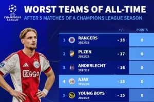 體育資訊11月26日訊 阿賈克斯在本輪歐冠不敵本菲卡,延續了本賽季至今的糟糕表現,《轉會市場》統計顯示他們也是歐冠歷史前5輪同期戰績并列第4差。