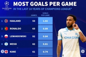 體育資訊11月26日訊 馬賽在本輪歐冠2-1逆轉紐卡斯爾,奧巴梅揚梅開二度。《轉會市場》統計顯示,他也是近10年歐冠場均進球榜前十。