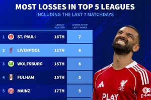 體育資訊11月26日訊 利物浦在本輪英超主場0-3慘敗諾丁漢森林,延續了近期糟糕表現,《轉會市場》也統計了五大聯賽近7輪輸球最多情況,利物浦位列次席。