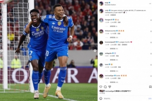 本場比賽姆巴佩上演大四喜,維尼修斯也送出兩次助攻。賽后維尼修斯社媒曬出與姆巴佩慶祝合影,配文寫道:“一場大勝,姆巴佩獨中四元,取得歐冠第27次助攻,未來還有更多!”