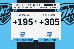 本賽季前18場比賽雷霆總凈勝分為+305,為NBA歷史最佳;上賽季同期雷霆該數(shù)據(jù)為+195。