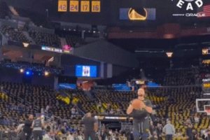 賽前熱身環節,庫里秀了一把空接背扣,落地后還原地轉身耍帥,心情不錯。