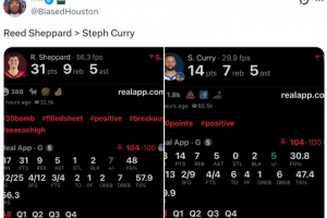 賽后火箭媒體人@BiasedHouston曬出謝潑德和庫里本場數據,寫道:“謝潑德>庫里。”