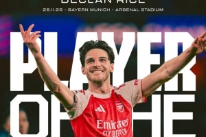 體育資訊11月27日訊 歐冠聯賽階段第5輪比賽,賴斯踢滿全場,幫助阿森納主場3-1擊敗拜仁。